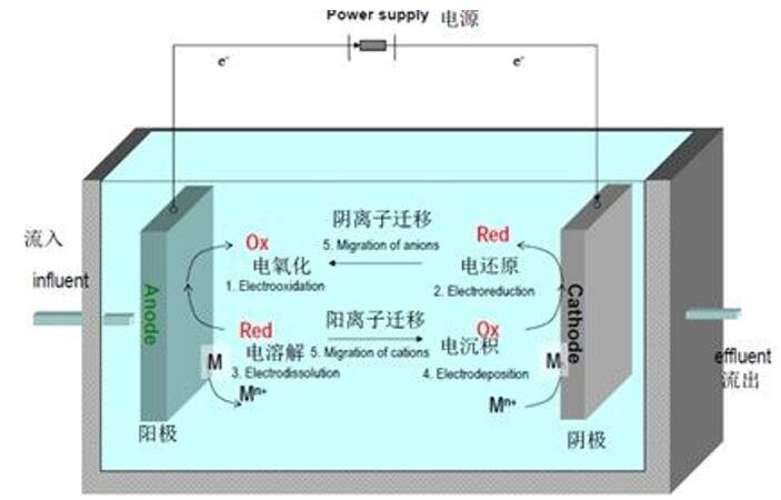 常溫常壓下,通過(guò)在極板上施加一定的電壓,水中的污染物在電極上發(fā)生直接電化學(xué)反應(yīng)或利用電極表面產(chǎn)生的強(qiáng)氧化性活性物質(zhì)使污染物發(fā)生氧化還原反應(yīng),從而破壞水中的有機(jī)物顯色基團(tuán)以及復(fù)雜的分子鏈(如絡(luò)合鏈和鰲合鏈),使其分解為小分子有機(jī)物或離子;氨氮、有機(jī)物轉(zhuǎn)成氮?dú)夂投趸肌?nbsp;